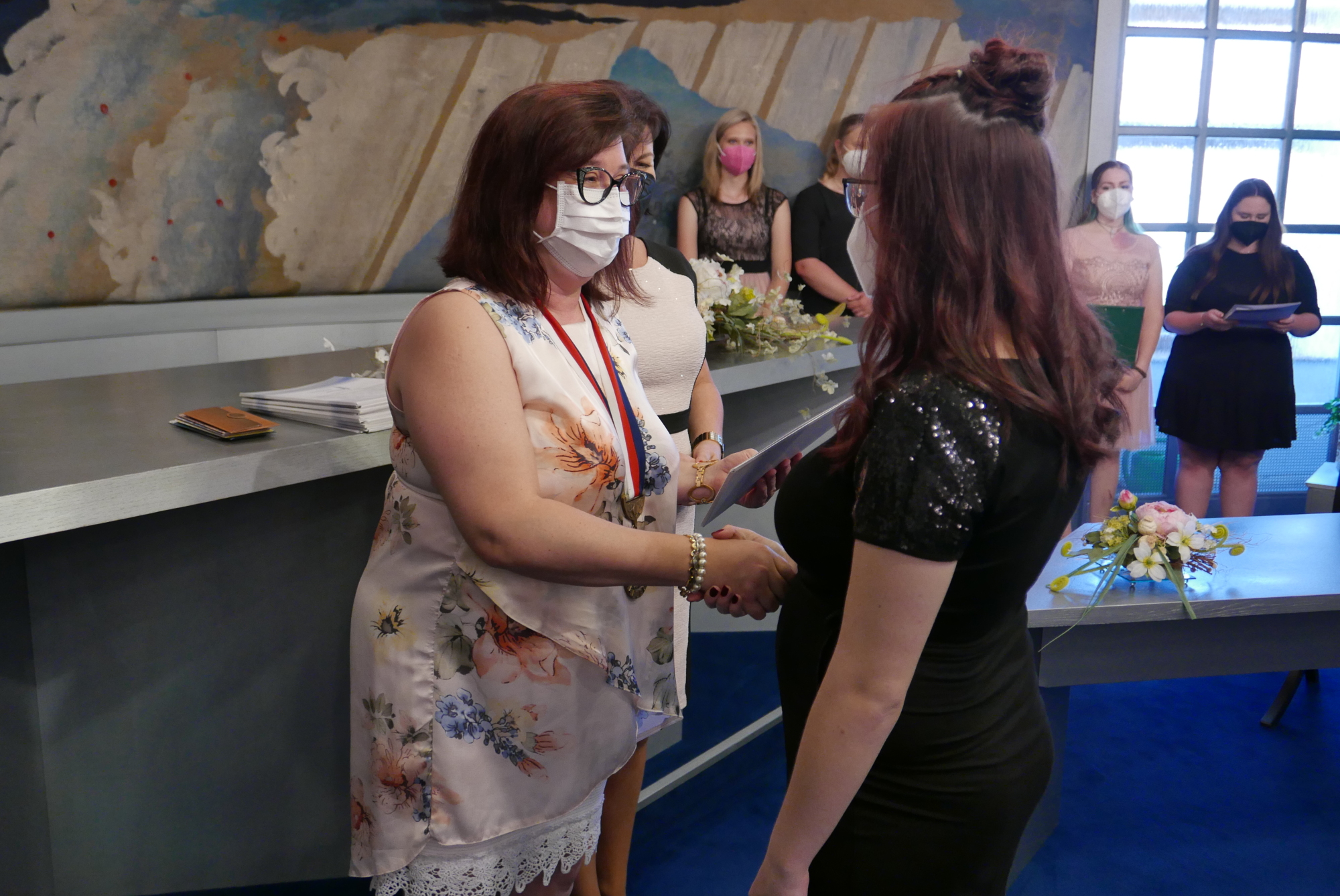 Maturitní vysvědčení obdrželi absolventi oborů Gymnázium, Veřejnosprávní činnost a Sociální činnost 18. 6. 2021 na moravskobudějovické radnici. Vysvědčení a ocenění za aktivity během celého studia předávala místostarostka města Jana Kiesewetterová a ředitel školy František Dubský.